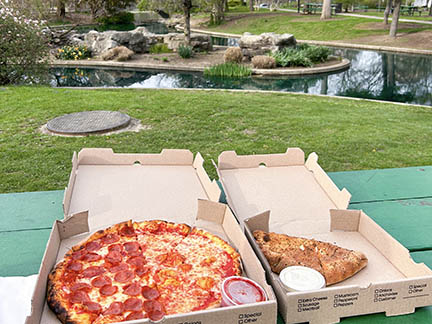 Appetizers, salads, and pizza, which are perfect for picnic fare. Their pizzas are available in New York and Detroit style.